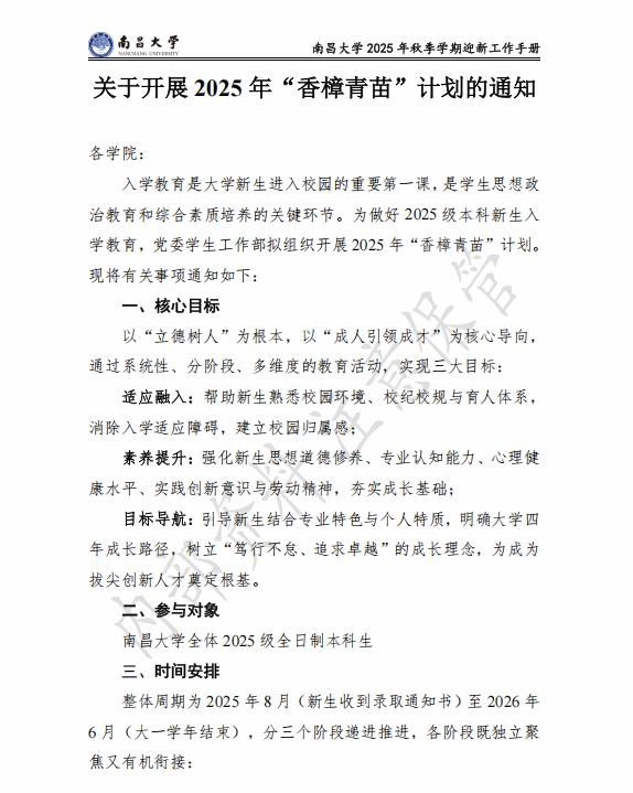 早在新生报到前,学校开展了2025年“香樟青苗”计划,系统推进2025级本科生入学教育。入学教育分为“集中教育”“大学适应”和“综合发展”三个阶段,包括理想信念与红色教育、校史校情教育、家校协同启蒙、心理健康教育、校规校纪等多元主题,为把学生培养成堪当大任的时代新人打下坚实基础。