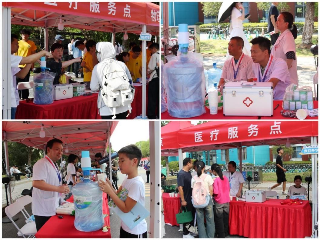 校医院医疗点前,急救药品、防暑物资分类整齐陈列,医护人员仔细检查着血压仪、急救箱等设备,随时准备为新生提供健康咨询、应急处理等服务,用专业守护为迎新工作加上“安全锁”。