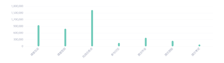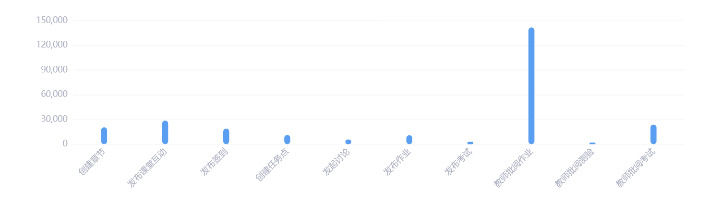教师课堂活动发布数28657个;新增任务点11242个;教师发布作业数10918个,批阅作业数141495个;教师发布考试数2952个,批阅考试数23743个;教师发起讨论5691次,回复讨论2359次。