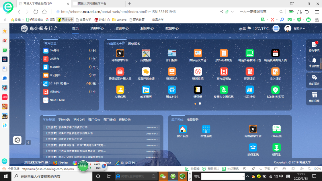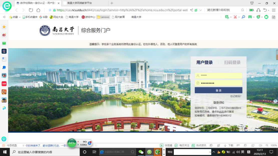 根据国家互联网管理的有关要求,为增强网络的安全性,进入南昌大学网络教学平台应采用学校综合服务门户跳转或学校统一身份认证登录(采用统一身份认证登录的系统账号密码只需记住一个就行了)。