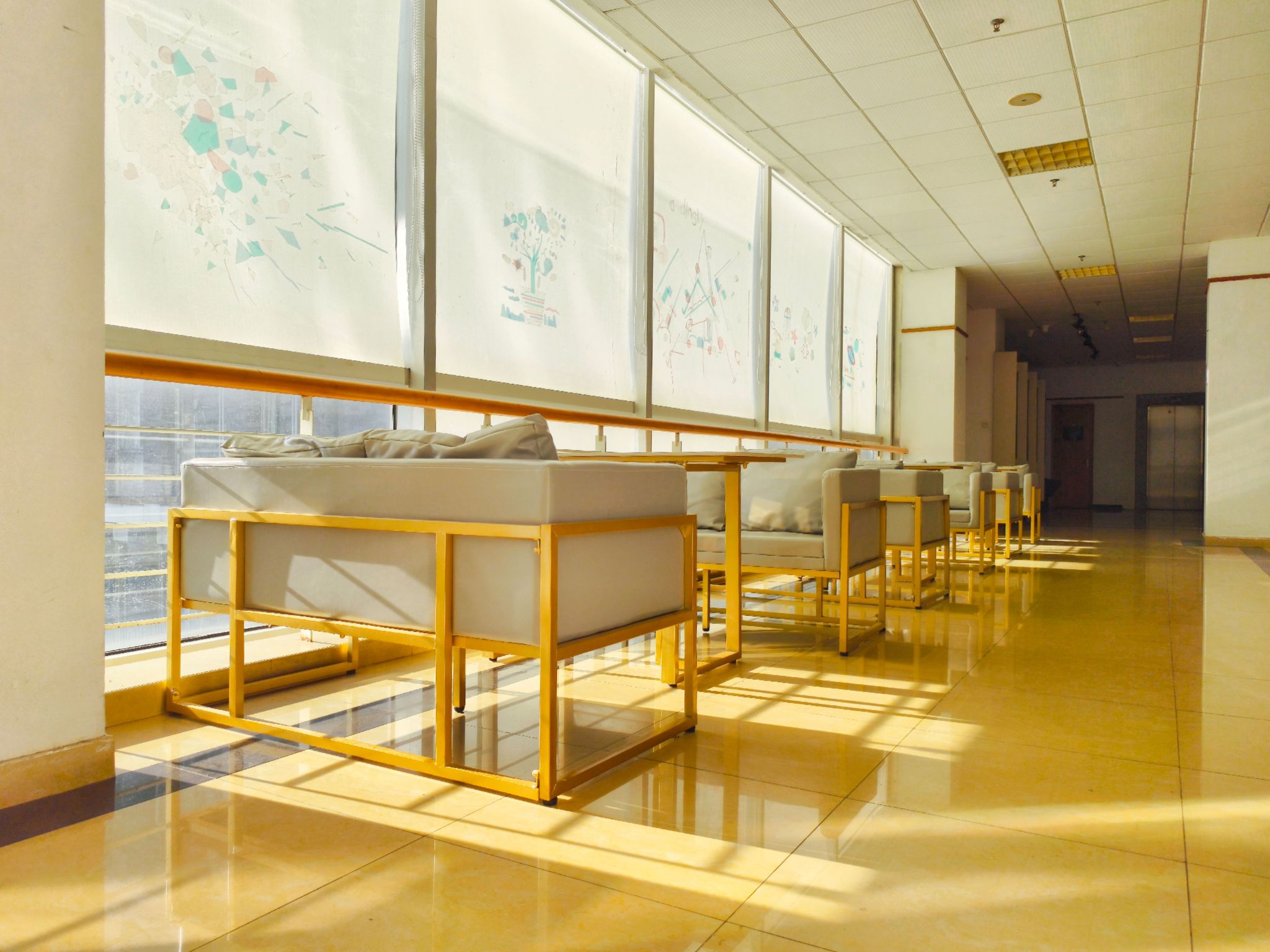 艺术楼三楼、四楼、五楼现代简约风格的连廊,在这里,窗外的美景与室内的宁静相互辉映,无论你是需要思考问题、发呆放松还是静静阅读,这里都能满足你的需求。