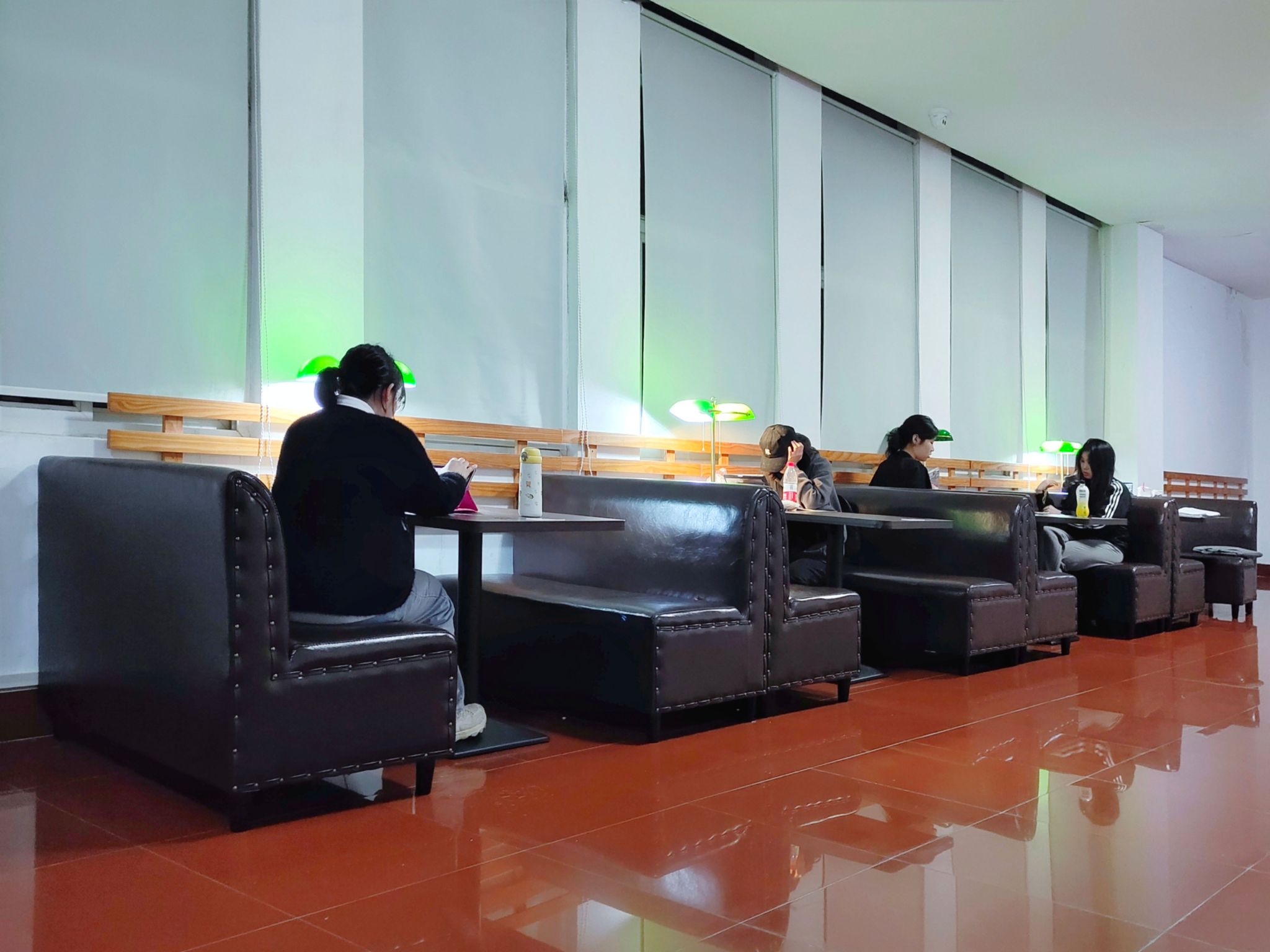 慧源楼四层“致新长行轩” ,宽敞走廊配以柔软沙发,明亮台灯及便捷插座,欧式火车厢风格为师生的阅读之旅打造极致舒适与便利。