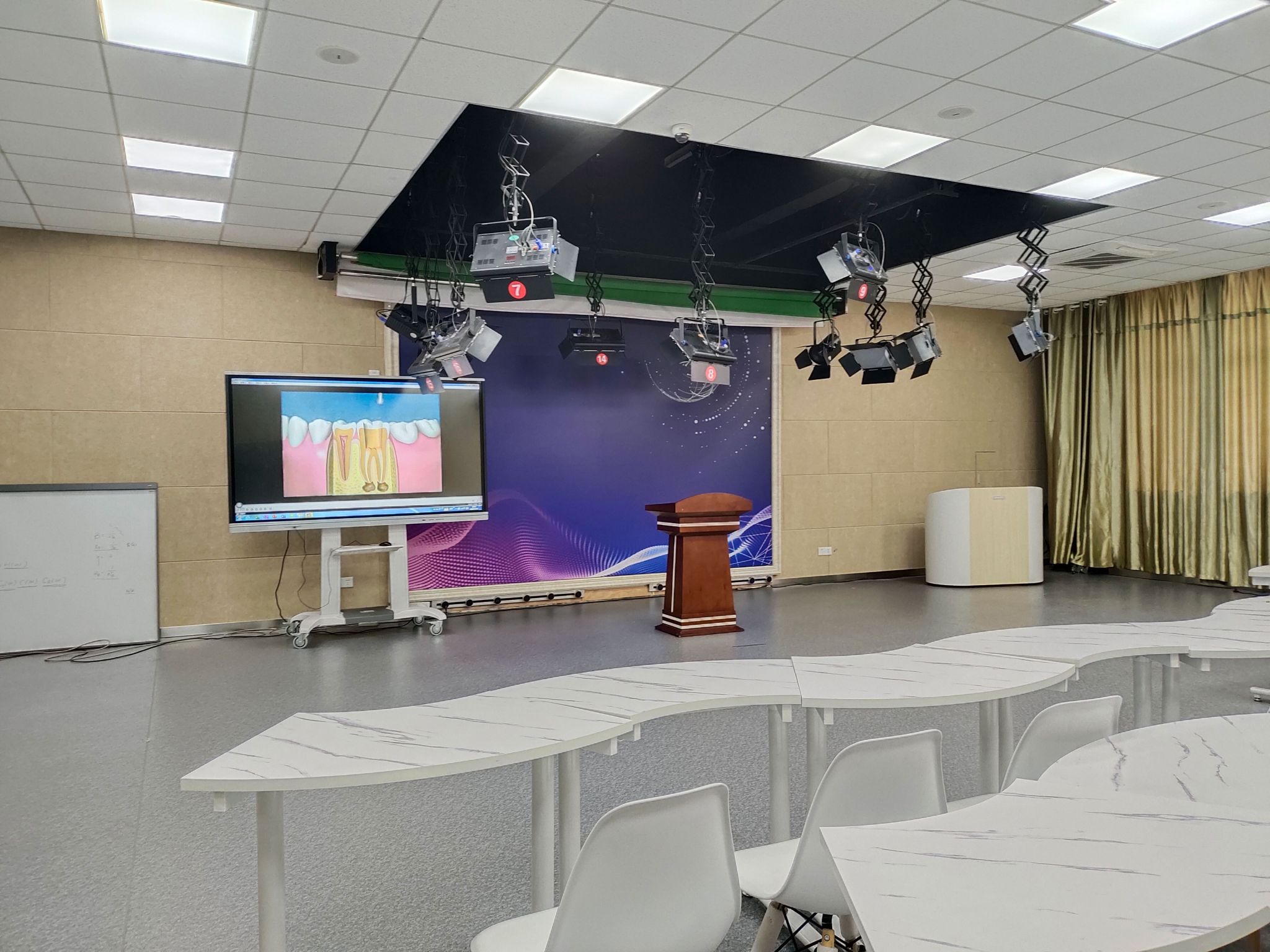 通过 VR/AR 构建一个三维沉浸式虚拟教学环境或虚实结合教学环境,方便教学交互,结合人工智能及大数据,综合构建多人互动 VR 教室,提供 VR 内容制作平台,教室安装专业灯光,提供三机位视频拍摄,可实现精品录播和虚拟录播功能。36座,由江西小核桃合作建设。