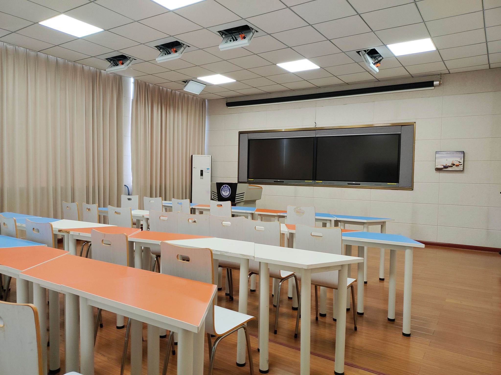 安装了艾维创智慧中控、互动智慧云盒、TCL互动教学一体机,讲台区域布置专业灯光和可升降的绿布背景,用于翻转和互动研讨课堂等教学应用场景,可实现精品录播和虚拟录播功能。30座,南京览众合作建设。